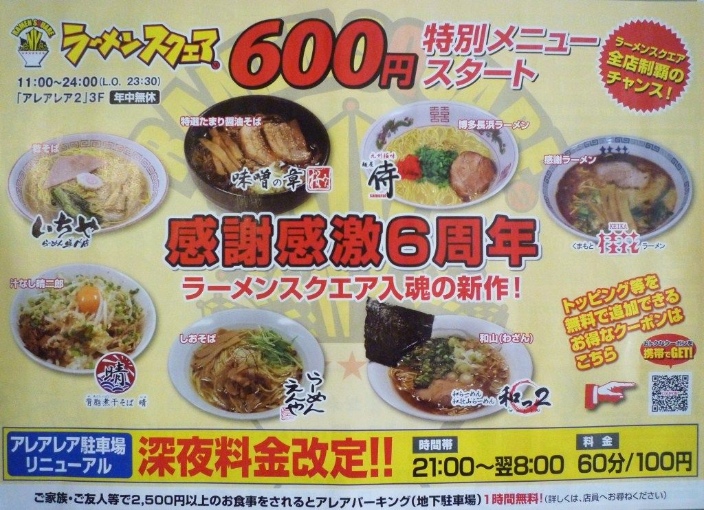 ¸½ºß¥é¡¼¥á¥ó¥¹¥¯¥¨¥¢¤Ç¤Ï³«´Û£¶¼þǯ¤òµÇ°¤·¤Æ¡¢³ÆÅ¹¤Ç600±ß¤ÎµÇ°¥á¥Ë¥å¡¼¤òÄ󶡤·¤Æ¤¤¤Þ¤¹¡£