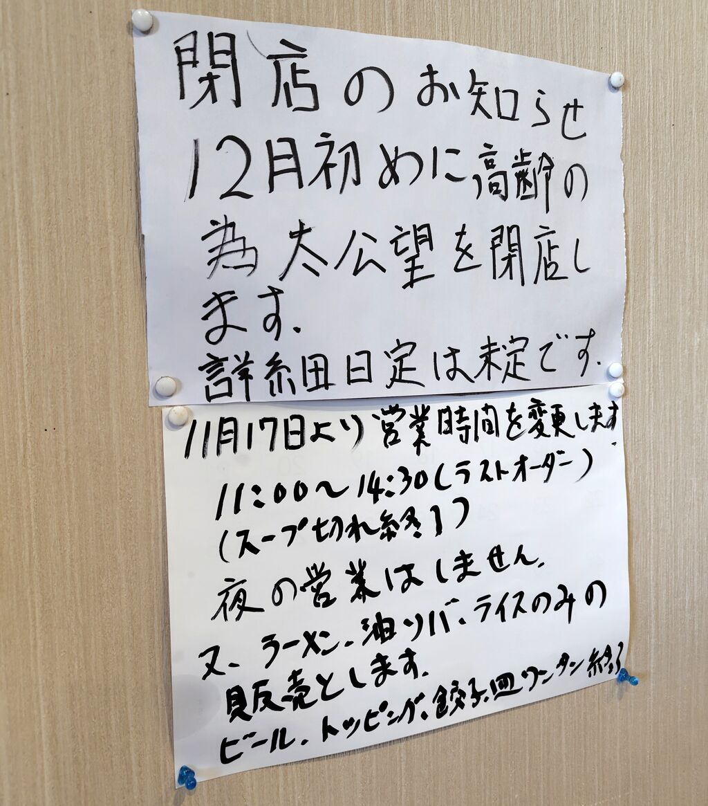 ·ôÇ䵡¤Î¾å¤Ë½ñ¤«¤ì¤¿¤ªÃΤ餻¤Ë¤è¤ë¤È11·î17Æü°Ê¹ß¤ÏŽ¢¥é¡¼¥á¥óŽ£¤ÈŽ¢¥é¥¤¥¹Ž£¤Î¤ß¤ÎÄ󶡤ÇÃë±Ä¶È¤Î¤ßÇä¤êÀڤ콪λ¤È¤Ê¤ë¤è¤¦¤Ç¤¹¤Í¡£